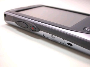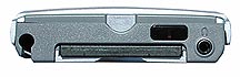 Aí é o Jornada visto de cima. Da esquerda pra direita, aquele buraco parecido com uma fechadura é onde fica a caneta. No meio está o slot CF (tipo 1 ou tipo 2 extendido). Logo acima dele, o botão branco é um botão e LED ao mesmo tempo, que pisca pra avisar de compromissos/carga da bateria/alerta de gravação de voz ativa. Mais pra direita, a tarja preta é o infravermelho e, ao lado, o plugue para fones de ouvido.