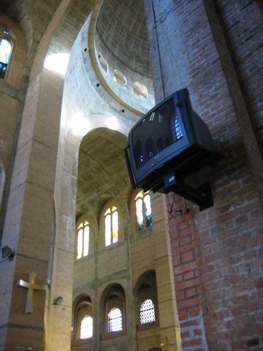 Chegando lá, fomos pra super-Basílica. Além de enorme, lá é bem legal, é a primeira igreja com dezenas de TVs do lado dos bancos...