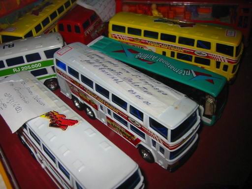 Numa das prateleiras tinha um tanto de ônibus de brinquedo. Sem entender, vi num deles um bilhete que dizia: