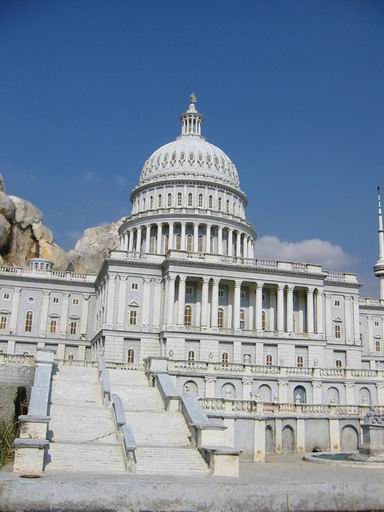 O parque tinha uma montanha-russa e uns brinquedinhos bobos. Mas tinha também uma atração chamada "mundo em miniatura". Essa era muito legal, tinha miniaturas bem realistas de dezenas de lugares famosos do mundo. Olha essa Casa Branca (ou Parlatório, nem lembro) aí embaixo, nem parece de mentira.