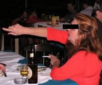 Aí fomos a uma pizzaria para comemorar. Assim que nos sentamos, eu ouvi uma voz rouca gritando: