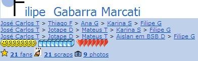 Gimme five Oct 27, 2004 • José Carlos Agora eu estou oficialmente assustado. Se eu clicar em qualquer pessoa no Orkut, há no máximo cinco pessoas me separando dela. Tipo, ela sempre é amiga de um amigo de um amigo de um amigo de um amigo meu. Medo.