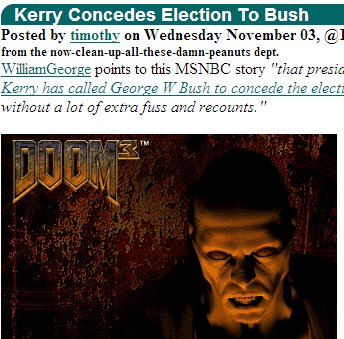 Slashdoom Nov 4, 2004 • José Carlos O Slashdot foi até poético hoje. A notícia, mais o banner de patrocínio abaixo, diziam: "Kerry concedes election to Bush. It's our doom."