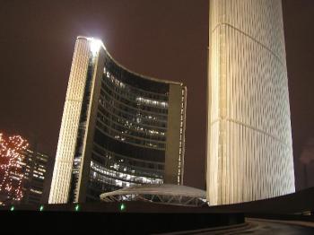 Depois voltamos para o centro. Um colega resolveu patinar em frente ao modernoso City Hall (abaixo) e o resto da equipe foi ao Eaton Mall, que já estava fechando.