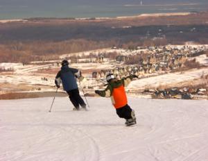 Segui as plaquinhas até a pista chamada "Graduate", feita para quem, hã, já se "graduou" no treinamento de iniciante. Ela era 30% maior e mais inclinada que a anterior. Depois que desci do lift, lá em cima, fiquei completamente embasbacado com a vista: dava para ver todo o resort, com a baía Georgian ao fundo (com um farol na margem e tudo).