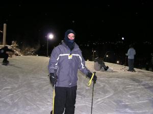Ah, olha aqui uma foto minha, já de noite, no alto da Graduate, com meu uniforme "esquiador Counter-Strike". Se um dia você for esquiar, siga meu conselho e leve uma balaclava como a minha: cobre o rosto todo, é uma maravilha contra o vento frio.