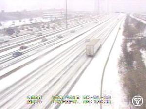 Quando saí de casa havia mais ou menos um palmo de neve cobrindo o carro. Devido ao tanto de gelo e neve na pista, tive que dirigir muuuuuito lentamente até o trabalho (média de 40km/h) ou o carro patinava. Dá uma olhada em como estava a estrada por onde passei...