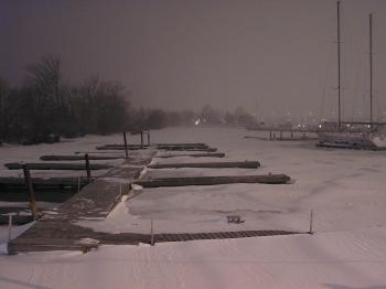 Depois fomos fazer um "mini city tour" pela nossa vizinhança. Fomos até o porto na margem do Lago Ontario. Havia uma pequena enseada com um pier que nem parecia um pier, pois estava sem os barcos e todo congelado.
