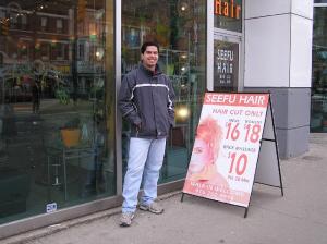 Mais tarde peguei o trem para Toronto. Descobri que a avenida Kensington é o point bizarro/underground/alternativo da cidade, com brechós e livrarias alternativas cheias de zines. E achei também, na chinatown canadense, o lugar perfeito pra quem quer se dar mal cortando o cabelo...