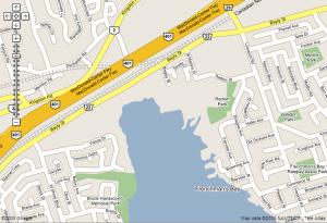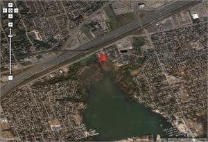 As fotos abaixo mostram o "antes" e "depois". O pontinho vermelho é onde eu moro aqui no Canadá. Dá pra ver a 401, a auto-estrada que eu pego todo dia pra ir trabalhar, e a Frenchman's Bay.