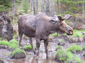 Mas o bicho que mais tinha em Algonquin era o alce. No total vimos uns quatro ou cinco alces. Apesar do tamanho eles parecem ser bastante dóceis: no domingo eu pude tirar fotos tranquilamente, a uns três metros desse aqui da foto. Só faltou a gente ver algum urso, mas não apareceu nenhum.