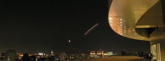 Vista do terraço do Blue Tree Faria Lima. O risco no céu - e o ponto brilhante - são aviões prestes a pousar em Congonhas