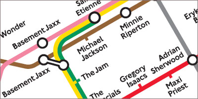 O cara usou o mapa do metrô de Londres para plotar estilos musicais, suas bandas importantes e suas interseções com outros estilos (mapa completo em PDF aqui). Obviamente tem lá suas falhas mas no geral ficou tão lindo que eu quero imprimir isso em formato grande e pregar na sala da minha casa.