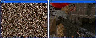 A tela da direita é o Quake 2 normal. A da esquerda é o Quake 2 renderizado como estereograma - sabe aquelas figuras estilo "olho mágico", que você "cruza" o olhar e consegue enxergá-las em 3D? É isso. Não parece, mas naquele monte de pontinhos dá pra ver a mesma sala mostrada na figura do lado em toda a sua glória tridimensional.