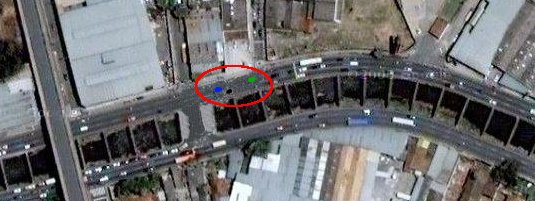 No ponto da foto abaixo faltavam uns 2km pra eu chegar em casa. Eu sou o pontinho verde. O pontinho azul é um Fiesta, e o pontinho preto é um motoqueiro, todos deslocando-se a uns 60km/h da direita para a esquerda da foto.