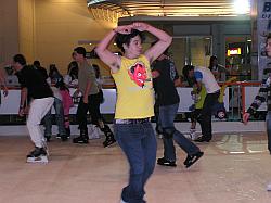 Em outra das noites, após a peregrinação obrigatória, fomos experimentar um ringue de patinação no gelo que montaram num shopping. Levei de brinde algumas bolhas nos pés e essa foto aí do lado, que minha irmã bateu. É de um gayzinho que passou horas rodando, como uma bailarina, no centro do ringue.