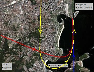 Aproximação normal (em azul), da Varig (em vermelho)... e a nova, a da TAM (em amarelo)