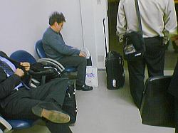O "ET Maneta" da sala de bagagens (esq.) e Marcos Frota esperando o avião (dir.)
