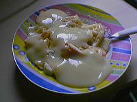 Preparo: Pique as frutas e bote num prato. Depois, por cima desta saudável refeição, salpique o leite em pó, o Neston e depois taque leite condensado para acabar de avacalhar com tudo. Coma com um garfo e bastante culpa.