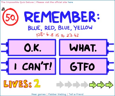 Acabo de perder umas duas horas do meu dia nele e só cheguei até a pergunta 50 (são 99!), que reproduzo aí embaixo pra vocês terem uma noção do nível das perguntas...