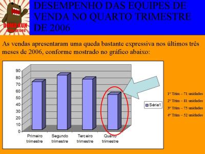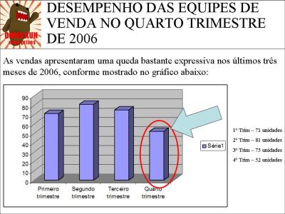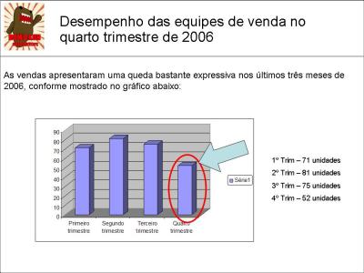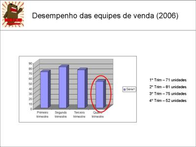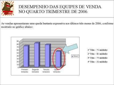 Vamos queimar um pouquinho de fosfato extra com o título do slide: "desempenho das equipes de vendas no quarto trimestre de 2006". Precisa mesmo dizer que é no "quarto trimestre" se no gráfico ele está mais do que destacado? E no parágrafo logo abaixo você fala de novo do bendito quarto trimestre. Arranque fora.