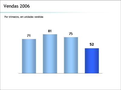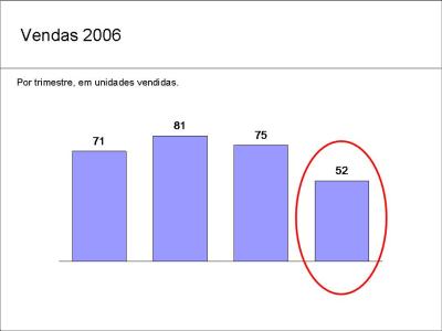 Agora, leia de novo o parágrafo do meio do slide: "As vendas apresentaram uma queda bastante expressiva nos últimos três meses de 2006, conforme mostrado no gráfico abaixo". Este é um excelente exemplo de embromação. Afinal de contas, que informação nova este texto acrescenta ao slide? Já sabemos que é em 2006 (o título mostra isso), que é no último trimestre e que as vendas caíram (o gráfico mostra isso, e durante a apresentação isso vai, obviamente, ser citado). Arranque fora, sem dó. E veja a diferença...