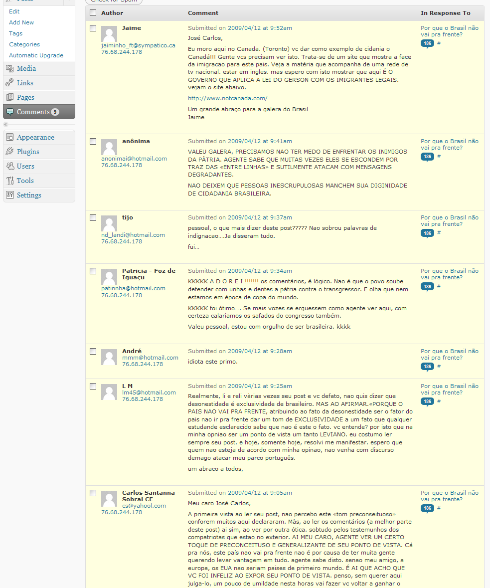 Foi aí que eu percebi que o "monte de gente" não era bem um monte de gente, era uma pessoa só escrevendo um monte de comentários com vários nomes diferentes. A imagem abaixo é da tela de aprovação de comentários (clique para ampliar). Observe que todos eles vieram do mesmo endereço IP (76.68.244.178)...