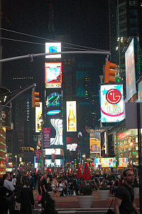 Nas nossas idas e vindas sempre estávamos passando por lá. Tem de tudo: caricaturistas, cowboy de sunga tocando violão e pedindo esmola, profeta do apocalipse com plaquinha “o fim está próximo”, flauta peruana, turistas russas recém-enriquecidas desfilando de minissaia (apesar do frio) e bancando a periguete, MUITA polícia (ecos do 11 de setembro, ainda fortes), e se você ergue os olhos do nível da rua, dá de cara com os luminosos das lojas, vários enormes e todos em alta definição. O mais embasbacante deles era o da American Eagle Outfitters. Era imenso e cobria a fachada da loja inteirinha num arranjo meio cubista. A propaganda de lingerie da loja era uma mocinha de 45 metros de altura saltitando no telão, de lingerie e segurando um girassol – e em uma impecável very high definition, de dia ou de noite. Era hipnótico. Bethania é que pareceu não gostar muito da minha admiração pelas belezas da, er, publicidade.