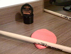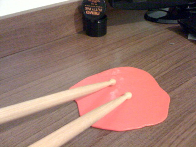 O Putty Pad é uma massa plástica, semi-rígida. Você tira do potinho, “desenrola” na mesa como se fosse massa de pão e, quando toca em cima, as baquetas repicam exatamente como num tambor.