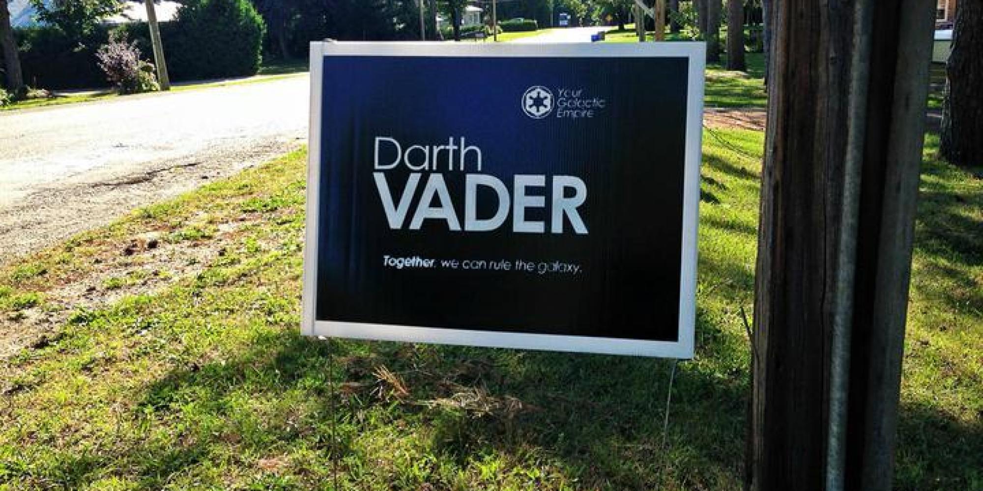Com a eleição chegando, o bairro se enche de plaquinhas dos candidatos nos gramados em frente às casas - que, obviamente, só podem ser colocados pelo dono da casa. Se você nao apoia ninguém, pode dar aquela zoada: