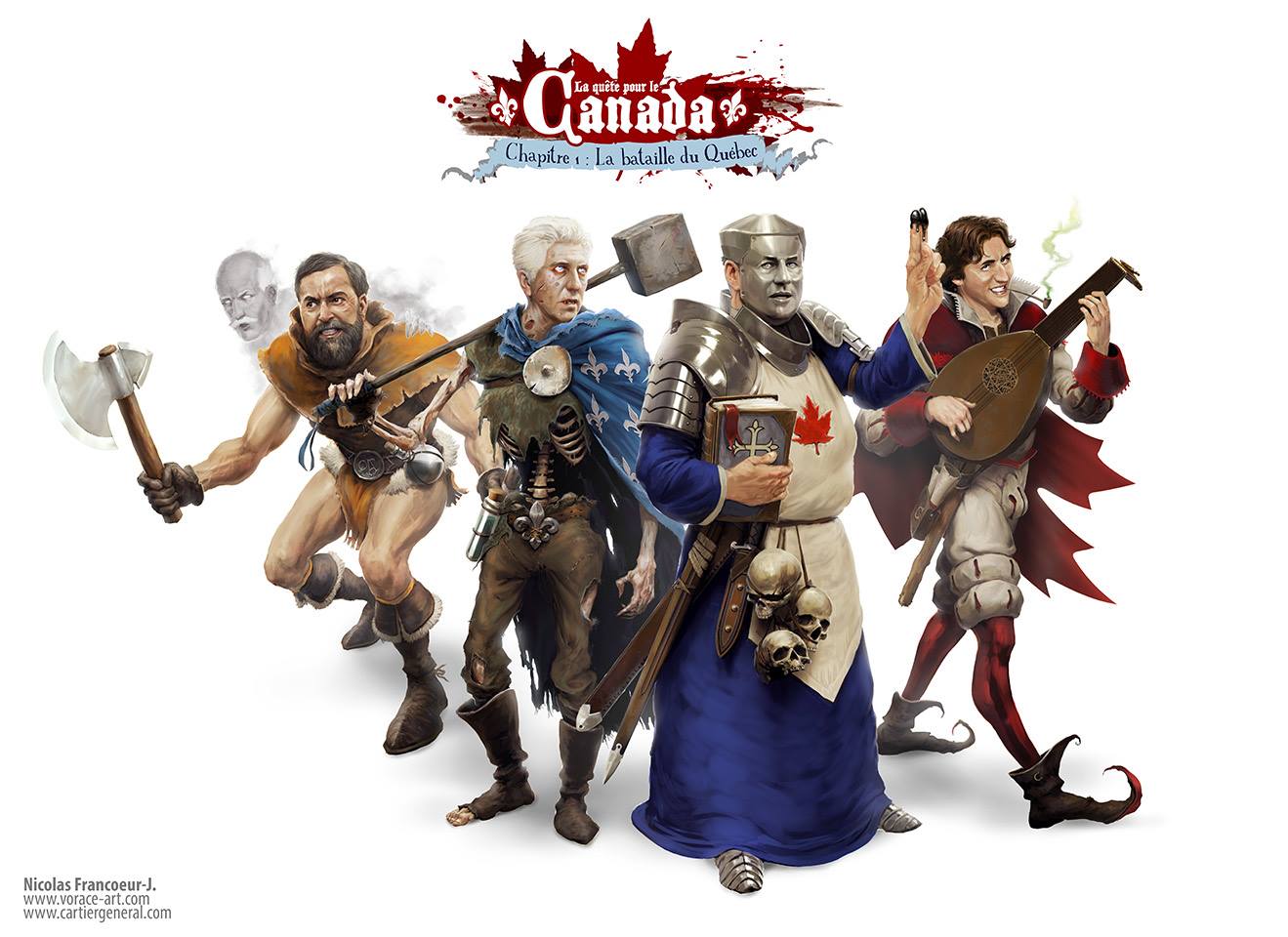 O cartoon abaixo, simplesmente genial, resume tudo no melhor estilo RPG: Harper é o clérigo sem emoções, Trudeau é o bardo fumador de cachimbo, Mulcair é o guerreiro ambidestro e o Duceppe é o morto-vivo.