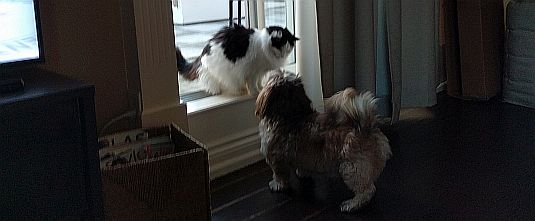 Junto com os papeis da adoção veio um PDF enorme de procedimentos com felinos, incluindo uma seção sobre como introduzir cães à gatos que pode ser resumida em uma frase: "não vai ser fácil". Felizmente, violência não seria problema, já que Pavlov é praticamente Gandhi em forma de cachorro e a gata é incrivelmente passiva quando ameaçada - fato já demonstrado pelo fato dela ter ficado uma semana debaixo da ponte no mesmíssimo lugar. O duro é que Pavlov, também honrando a reputação científica, ficou extremamente curioso com a gata e queria desesperadamente cheirar e pegar e rodear e ficar o tempo todo próximo dela... isso tudo no momento mais traumático pra ela, que é a mudança de ambiente. O "manual" em PDF da gata já alertava que seriam umas duas semanas até ela se acostumar com a casa nova - e isso se não tivesse o cachorro.